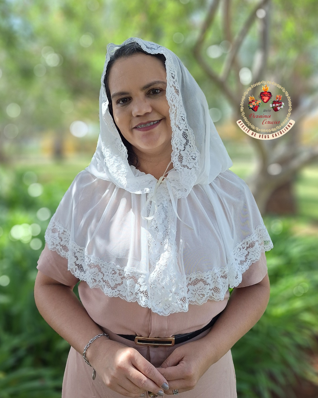 Véu Católico, modelo capuz, confeccionado em Tule de malha offwhite e acabamento em renda poliamida na mesma cor.