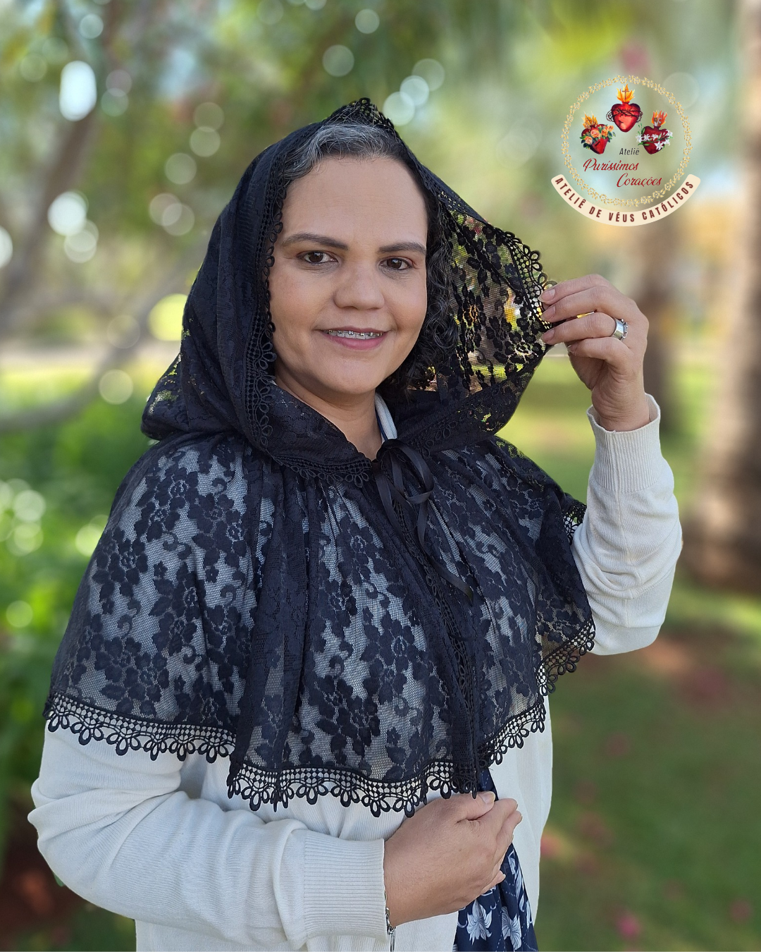 Véu católico, modelo capuz, confeccionado em Renda Floral preta e acabamento em gripir.