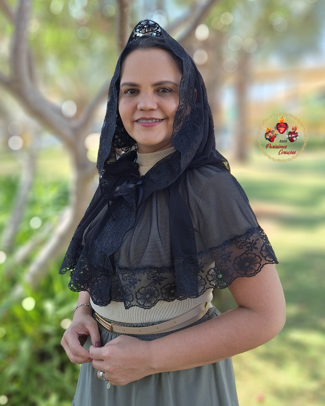 Véu católico, modelo capuz, confeccionado em Tule de malha Preto e acabamento em Tule bordado.