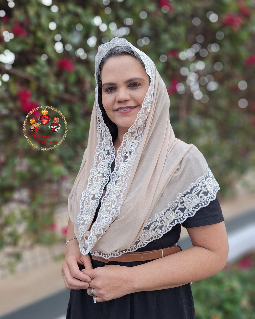 Véu católico, modelo Infinity, confeccionado em Tule de malha bege e acabamento em Tule bordado com detalhes dourado.