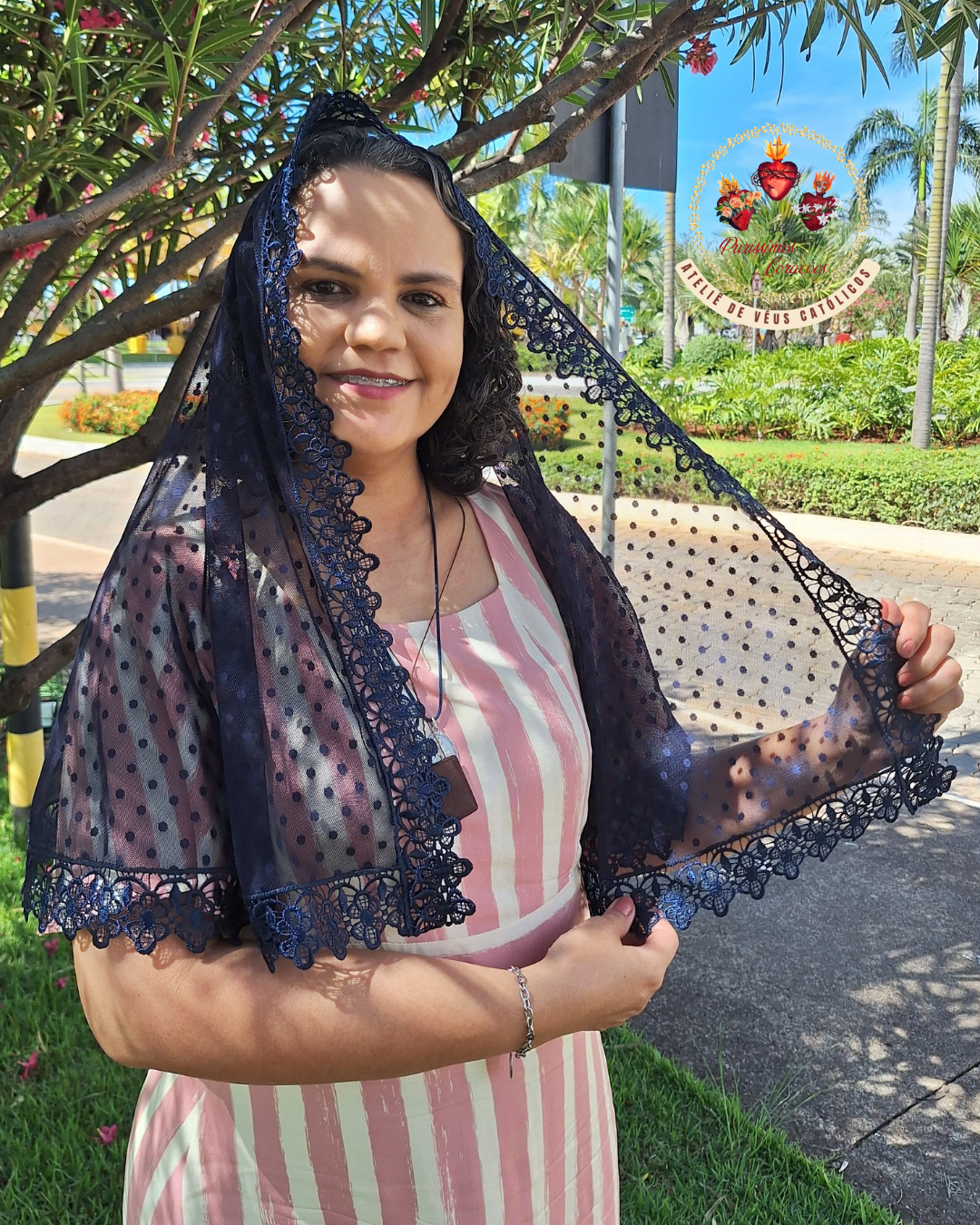 Véu católico, modelo tradicional, confeccionado em Tule de Poá azul marinho e acabamento em gripir.