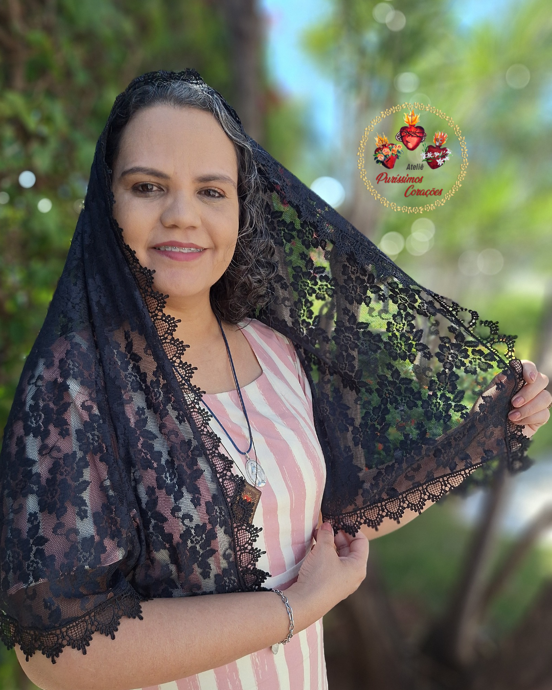 Véu Católica, modelo tradicional (oval) confeccionado em Renda Floral maleável preta e acabamento em gripir