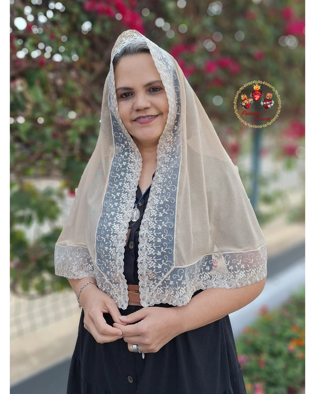 Véu católico, modelo tradicional, confeccionado em Tule de malha bege e acabamento em Tule bordado.